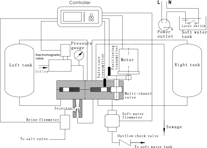 RF double tank floating bed plane multi-way valve, realized tow tank softening at the same time and regenerating alternate, integrated with brine jet device and brine flow meter and brine electric valve, with soft water flow meter, guarantees the water softening , the water regenerating and water filling to salt box, Complete according to the set volume.as long as the factory according to the raw water hardness set corresponding operation parameters, can always guarantee the stable operation of the equipment, guarantee the softened water and salt consumption.Soft water level control contact input, 485 communication interface, external control input interface, same as ZR series for high hard water softening.